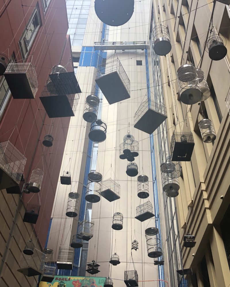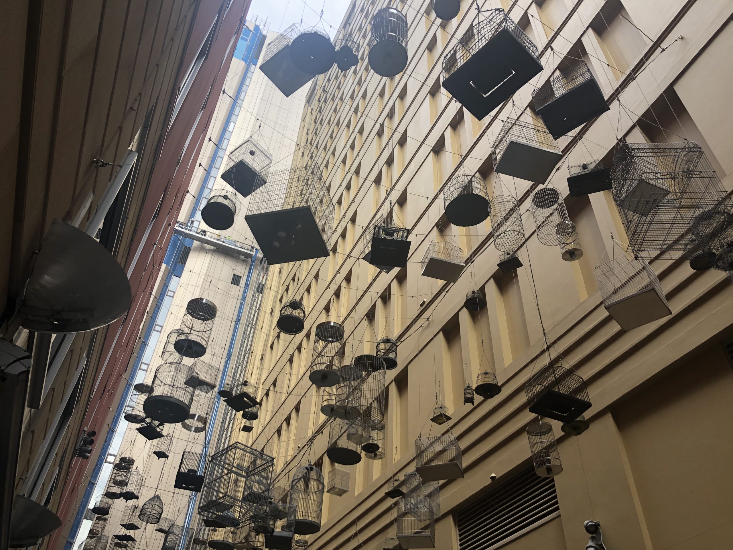 鳥のさえずりがビルのはざまにこだましているが、見上げるとそこはたくさんの鳥かごが宙に浮いているだけ……